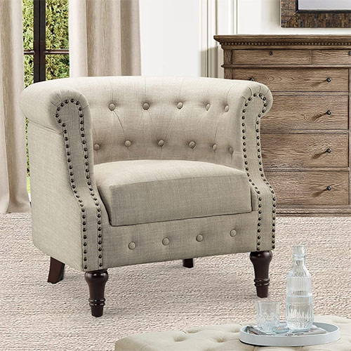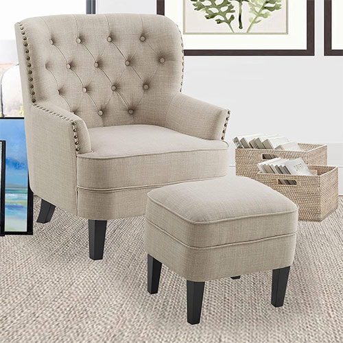 Rosevera Ember Accent Chairs combine classic design with plush comfort, featuring tufted button details and a matching ottoman for ultimate relaxation. Crafted with durable rubberwood frames and soft natural linen upholstery, they bring elegance and coziness to any room.